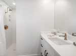 Luxurious Master Suite: Retreat to your private master suite with a king-sized bed, Smart TV, en-suite bathroom with a separate shower overlooking the Gulf, and a private outdoor shower on the balcony.