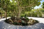 Grand Arrival: A winding driveway lined with lush tropical foliage leads to a beautifully landscaped courtyard with a private hot tub and inviting seating area.