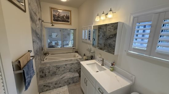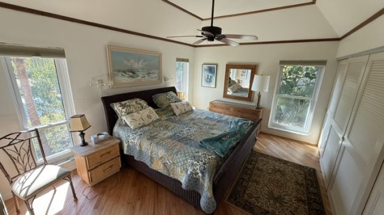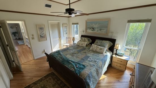 The primary bedroom features a king bed and a private en-suite bathroom with a jacuzzi soaking tub, creating a wonderful place to unwind after a day at the beach or out enjoying the island. The second bedroom offers a queen bed and its own full bathroom with a shower, making the home comfortable and convenient for couples, family, or visiting guests.