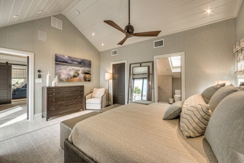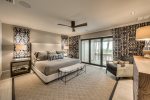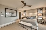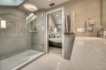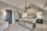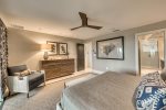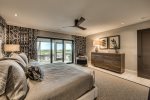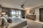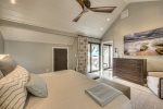 Downstairs Primary Suite: Features a King bed and a 55" TV with partial beach views and an en-suite bath.