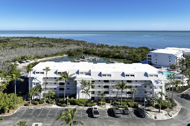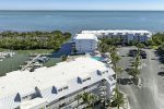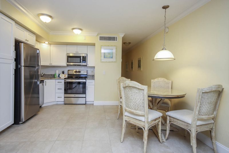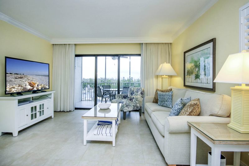 The condo offers a spacious living area that flows directly out to your screened lanai, immersing you in the tranquil bay environment.