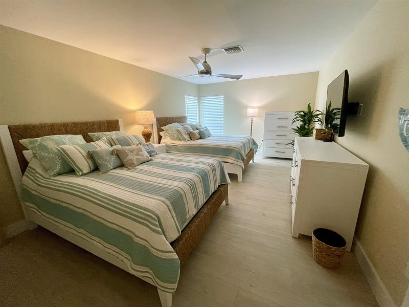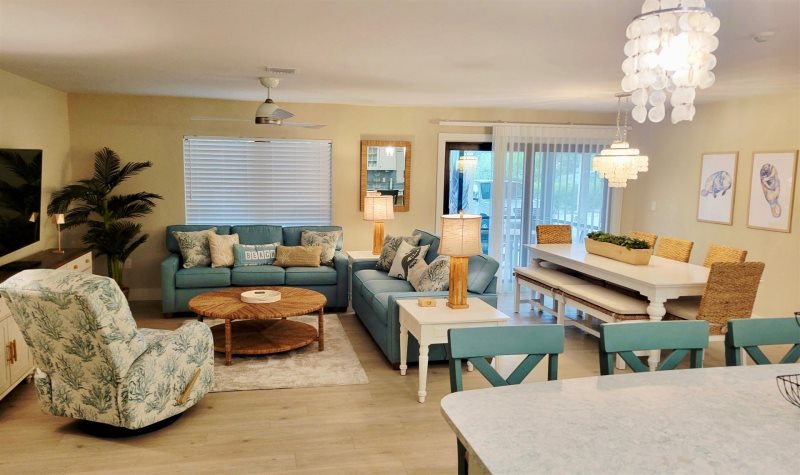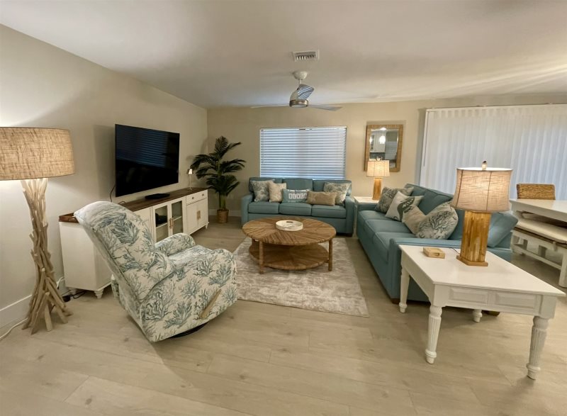 Welcome to Blind Pass F106, a ground-floor, oversized two-bedroom, two-bath retreat offering a generous 1,360 square feet of living space. This condo features a spacious, open floorplan, a 21-foot screened oversized lanai, and a split-bedroom layout for extra privacy. Every inch has been thoughtfully renovated in a modern, coastal style with relaxation and comfort top of mind.