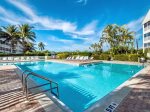 This unit has its own amenities, including a large lanai with a quaint marina, beautiful sunrise views, and frequent wildlife sightings (including osprey, migratory birds, manatees, and dolphins). The largest pool in the area, which was recently renovated and is heated, has a hot tub, lounge chairs, and bathrooms and is a very short walk to multiple beaches. Gas BBQ grills with tables and chairs on the pool deck. Large parking lot with access to covered and uncovered parking. Laundry facilities, bike