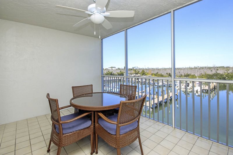 Inside, the condo is thoughtfully appointed with modern updates, a fully equipped kitchen, and an inviting living space designed for post-beach relaxation. The highlight of the unit is the private screened lanai, where the elevated second-floor position provides a beautiful vantage point over the lush grounds toward the tranquil waters of the bay.