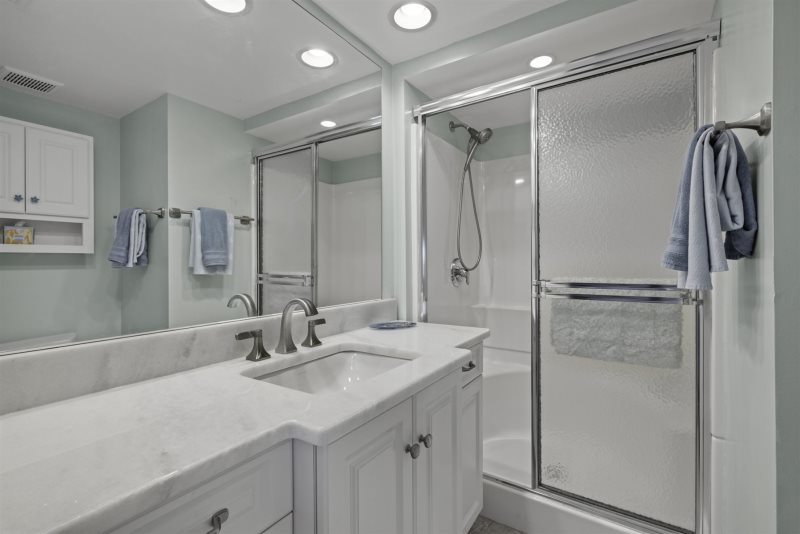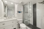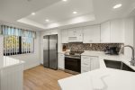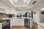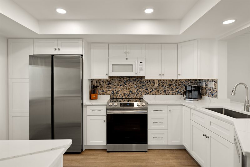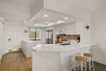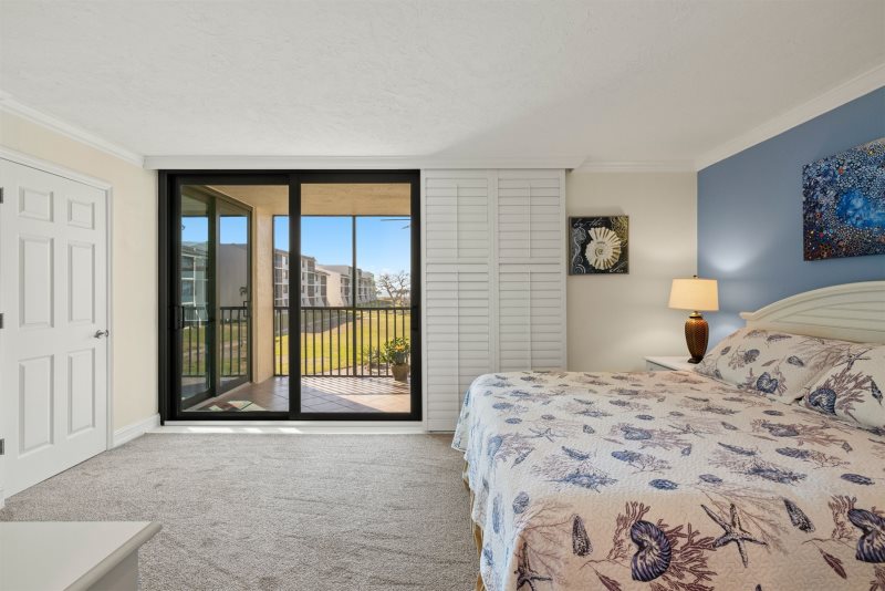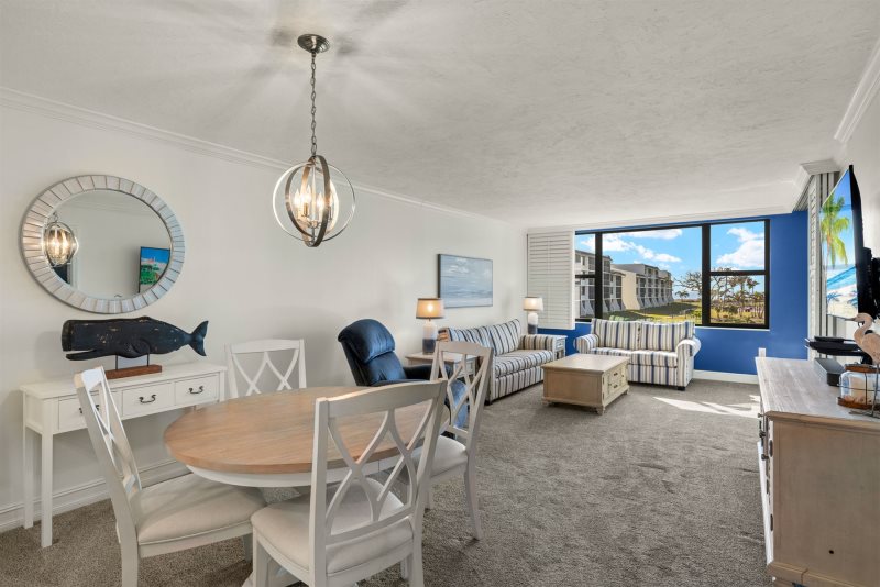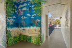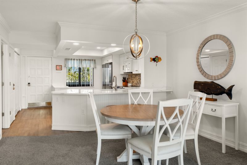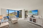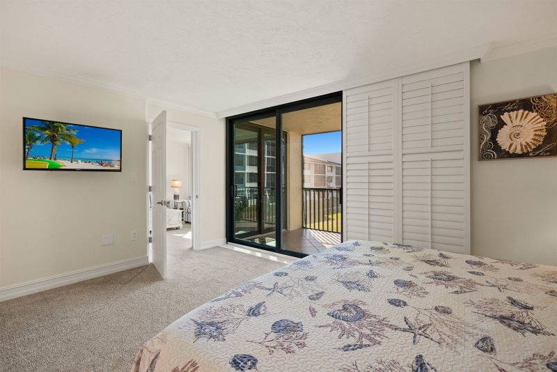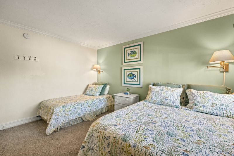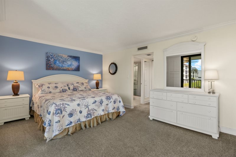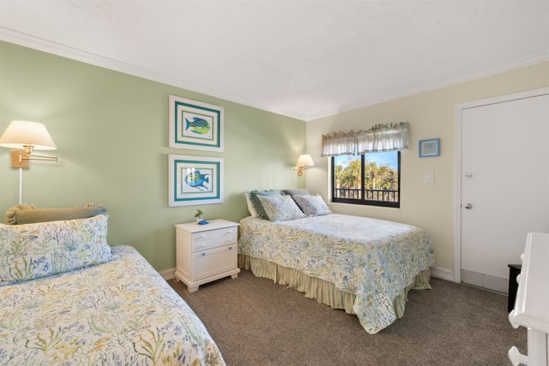 The primary bedroom suite features a king-sized bed and an en-suite bathroom, while the guest bedroom is thoughtfully arranged with one double and one twin bed. Following a recent update, the condo has been repainted in subtle blue tones and outfitted with all-new, modern beach decor and furniture to ensure a premium island experience.